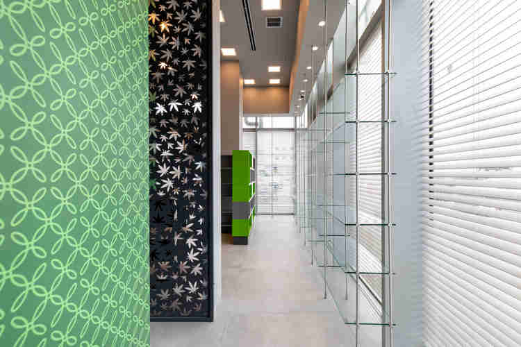 המעצבת יצרה יחד עם צוות העיצוב של דקובריק דגם ייחודי לבית המרקחת. מחיצות שהן סגורות וגם פתוחות. דוגמת עלי קנאביס בגדלים שונים ובזויות שונות. התוצאה מרהיבה!!!