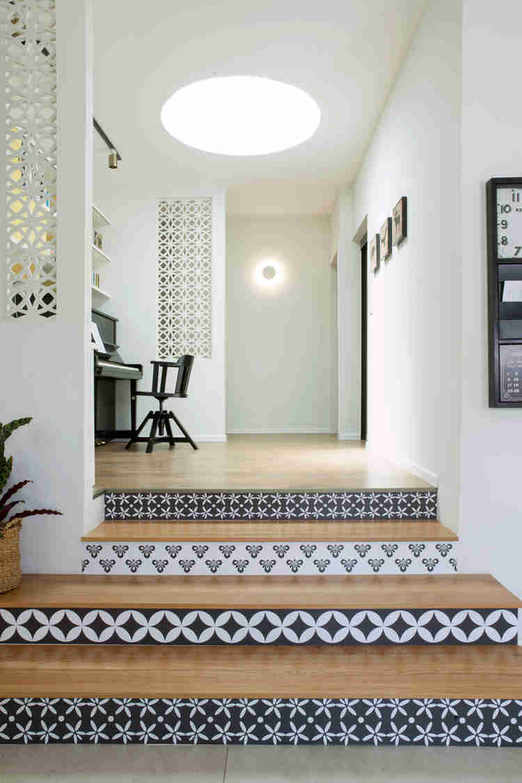 למעשה, המראה שנשקף מייד עם פתיחת דלת הכניסה הוא מראה הפתח החדש והרחב, עם מדרגות רחבות ומיוחדות, ועם שני חלקי הדקובריק שממסגרים את המרחב.